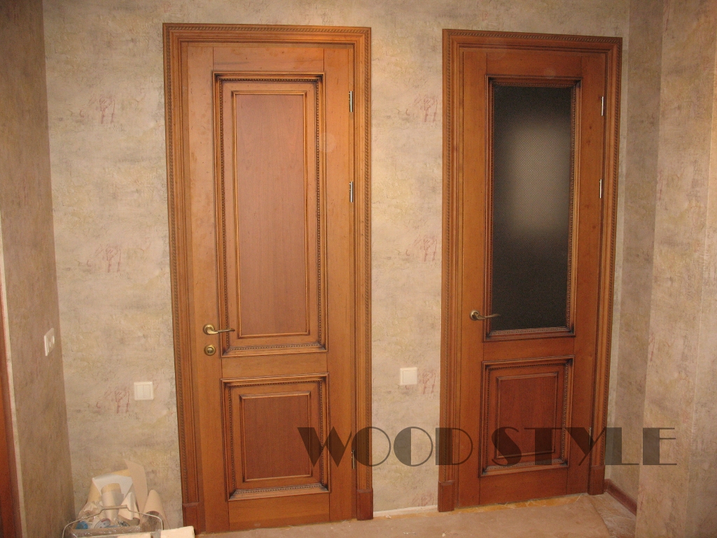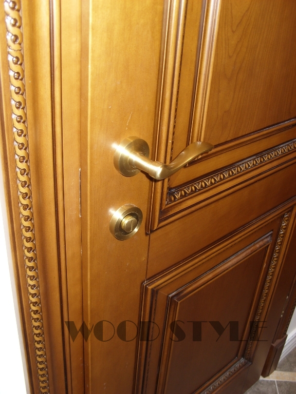 Дверь отделывается качественными лакокрасочными материалами, при отделке дверей возможны любые варианты покрытия: тонировка в нужный цвет, патинирование, золочение, покрытие эмалью, браширование, художественная роспись дверей.
